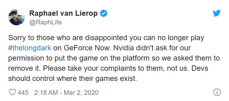 Raphael van Lierop在推特上表示:这里要对那些希望在GeForce NOW上玩到《漫漫长夜》的玩家们说一声抱歉,不能玩到让你们失望了。英伟达并没有征求我们的同意就擅自让游戏登陆了他们的平台,所以我们让他们下架了。所以要抱怨的话找英伟达,而不是我们。开发商应该有掌握自己游戏登陆哪一个平台的权力。