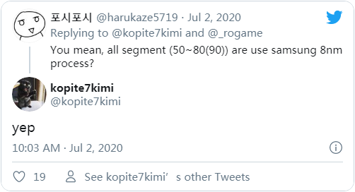 近年来,台积电高端制程的客户需求量一直很大,AMD 也将自己的芯片订单都交给了它。此外从 Twitter 上的爆料来看,三星 8nm 工艺衍生自 10nm,但能效提升了 10% 。