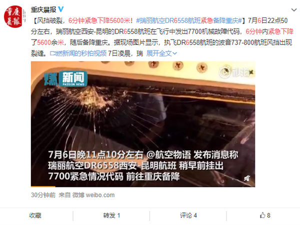 据国内媒体报道,7月6日22点50分左右,瑞丽航空由西安飞往昆明的DR6558航班在飞行中发出7700机械故障代码,6分钟内紧急下降了5600余米,当晚23点28分备降重庆江北机场。有媒体获得的飞机落地后照片显示,DR6558航班左前风挡出现不规则裂缝。