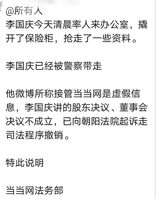 李国庆还谈到,“我作为当当董事长,首要目的是要保证当当的正常经营,这一点不用担心。请员工也安心工作,目前组织架构不变,大家各司其职。当当股东之间出现了一些纠纷是暂时的。当当没错,员工没错,合作伙伴没错。”