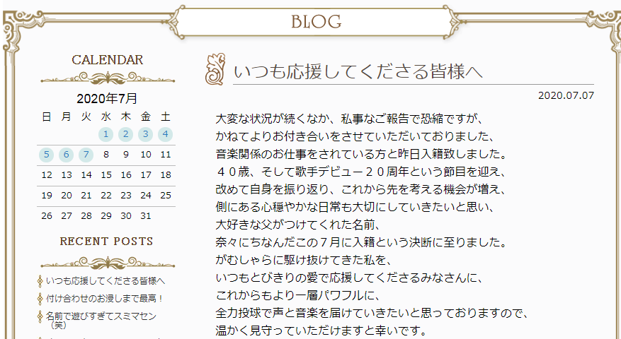 在7月7日今天,拥有无数粉丝的著名声优歌手水树奈奈在自己的官方博客上宣布已经于7月6日成婚,对方是从事音乐事业的男性,水树奈奈今年刚好40岁,从事歌唱事业20周年。