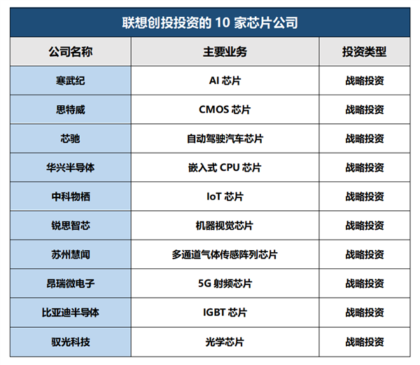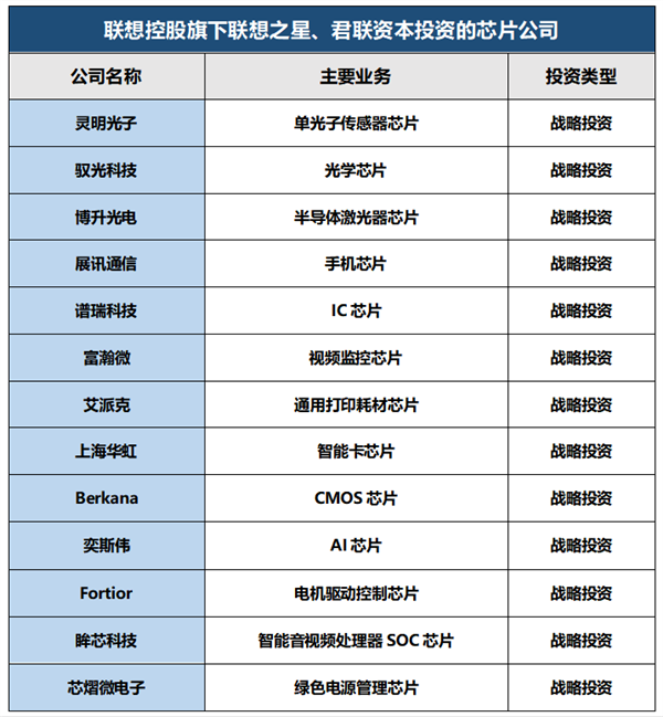 事实上,这并非联想第一次投资芯片公司。据联想官方透露,自成立以来,联想已经投资了数十家具有核心竞争力的芯片公司。比如联想集团旗下的联想创投投资的寒武纪、思特威、芯驰等,联想控股旗下的君联资本、联想之星投资的展讯通信、富瀚微、灵明光子、驭光科技、博升光电等。
