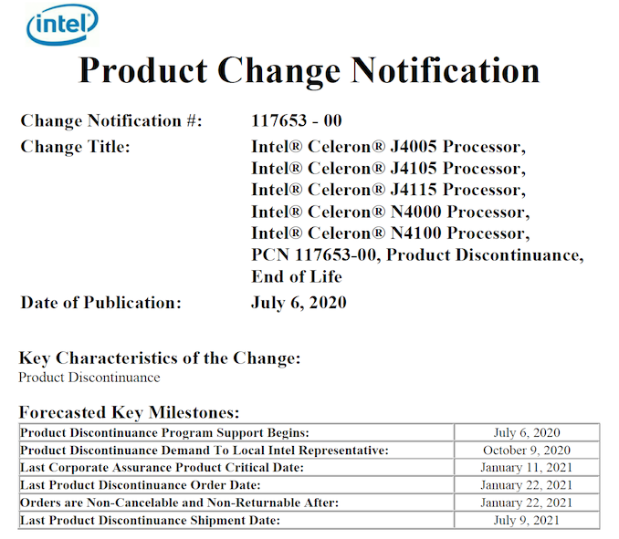 今天Intel发布通知,14nm Gemini Lake系列处理器开始退市,2021年1月22日为最后的订单日,2021年7月9日为最后的出货日。