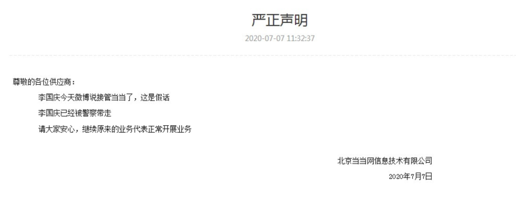 紧接着,当当再发声明称:李国庆说接管是假话,已被警方带走。