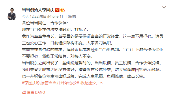 现在当当处在依法交接时期。打扰了。我作为当当董事长,首要目的是要保证当当的正常经营,这一点不用担心。请员工也安心工作,目前组织架构不变,大家各司其职。有盖章或者付款的需求,请联系我或者赴新当当筹备总部。当当上下游合作伙伴也不要担心,货款正常结算,对接人不变。