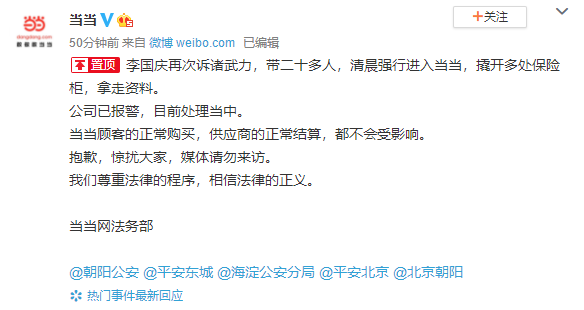 时隔 72 天,当当网和李国庆又出现在了公众的视野中。今日早间,当当网官方微博发布声明称,李国庆再次诉诸武力,带二十多人,清晨强行进入当当,撬开多处保险柜,拿走资料,公司已报警,目前处理当中。