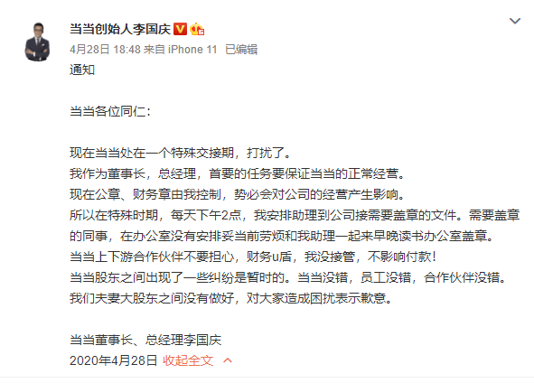 下午 13 点左右,李国庆再次在微博发声,拟提请董事会,批准其辞去当当 CEO 职务,仅保留当当董事长一职。并表示希望在战略布局、核心高管选拔、投融资等方面发挥更大的作用,搭建高效的公司治理结构,最大程度减少对职业经理人团队的经营决策干扰。