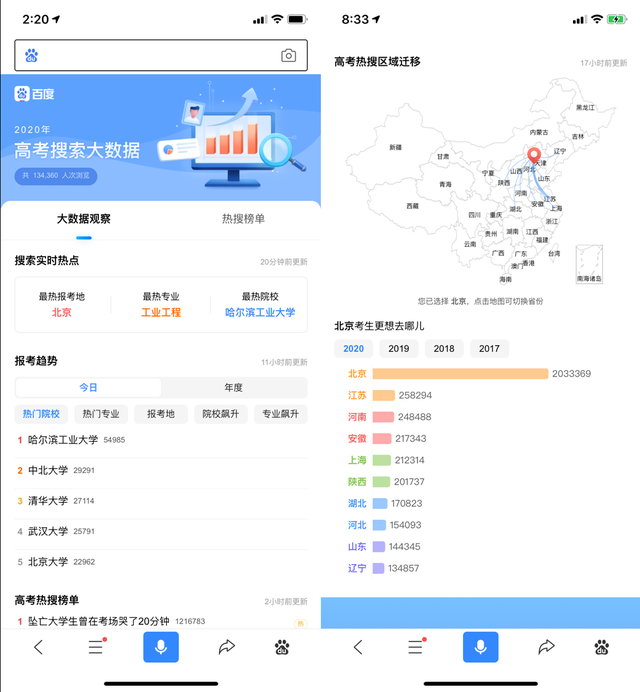 百度还推出高考大数据平台,通过大数据技术挖掘搜索行为和关注趋势,整合教育行业数据,形成了高考实时热点、高考热搜榜单、报考地域迁移、各地院校和专业报考趋势、智能报考等多维度版块,为考生选择院校、专业等提供信息参考。