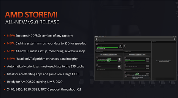 另外,AMD还同步放出了全新升级的StoreMI 2.0硬盘加速技术,首发支持X570主板,本季度内陆续支持X470、B550、B450、X399、TRX40主板。