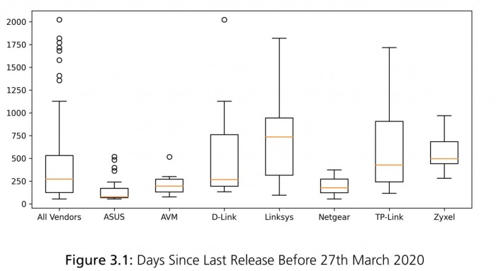127台路由器中,有46台在去年内没有收到过一次安全更新,而22台在过去两年内没有收到过任何更新。最严重的情况下已经运行了1969天,超过五年,没有安全补丁。华硕、AVM和Netgear的产品在安全性方面名列前茅,他们的所有设备都在过去一年半内进行了更新,但D-Link、Linksys、TP-Link和Zyxel的产品却落后了。尽管约90%的路由器使用Linux, 许多制造商没有更新操作系统, 大多数产品内核版本仍然在2.6 (或更早), 这最后看到一个更新在2011年2月,这导致大量关键性和高严重性CVE影响这些设备。