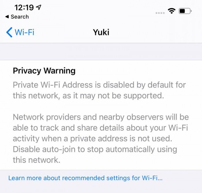 当连接到不使用私人 Wi-Fi 地址的 WiFi 网络时,Apple 会在 "设置 "应用中提供一条警告信息。