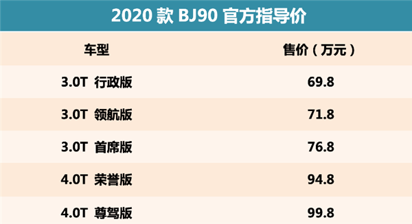 7月8日,据官方消息,北京越野旗下大型SUV——2020款北京BJ90正式上市,新车推出搭载3.0T/4.0T两种动力共计5款车型,售价区间为69.80-99.80万元。相较于奔驰GLS的103.8万元起售价格,新车便宜了30多万元。
