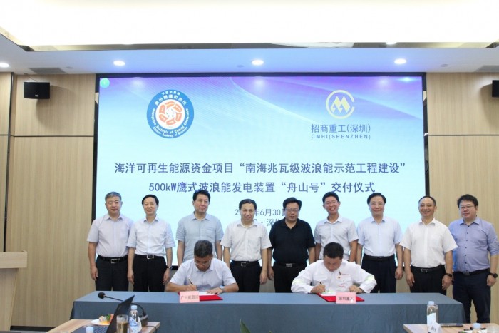 在建党99周年来临之际,自然资源部海洋可再生能源项目“南海兆瓦级波浪能示范工程建设”首台500kW鹰式波浪能发电装置“舟山号”正式交付。6月30日,由广州能源所研发设计、招商局重工(深圳)有限公司建造的500kW波浪能装置“舟山号”交付仪式在招商局工业集团孖洲岛基地举行,自然资源部国家海洋技术中心、中国南方电网创新管理部、广东电网有限责任公司、海南电网有限责任公司、三沙供电局、招商局工业集团有限公司、法国船级社、广州能源所等单位领导及项目组成员出席活动。