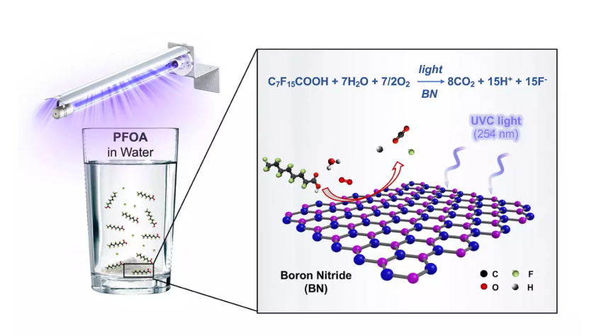 “观察结果是这样的,”研究负责人Michael Wong说。“你拿一个含有一些PFOA的水瓶,你扔进你的BN粉末,然后你把它密封起来。这就是它。你不需要添加任何氢气或用氧气净化它。只是我们呼吸的空气,被污染的水和BN粉。你将其暴露在紫外线下,特别是波长254纳米的UV-C光下,4小时后回来,99%的PFOA已经转化为氟化物、二氧化碳和氢气。”