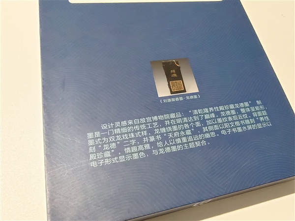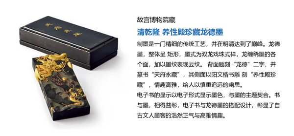 据了解,这款故宫文创联名版YOGA电纸书设计灵感来自故宫博物院藏品:“清乾隆养性殿珍藏龙得墨”。电子书墨水屏的显示以电子形式显示墨色,与龙得墨的主题契合。
