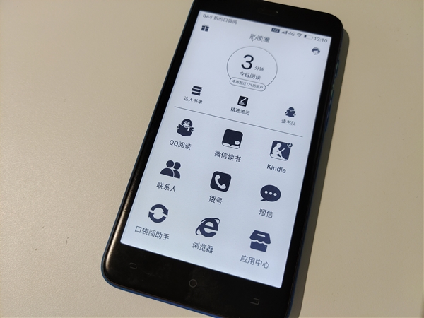 YOGA EBOOK READER采用E-ink电子墨水屏,主界面可以看到达人书单、精选笔记、读书队、QQ阅读、微信读书、Kindle、联系人、拨号、短信、口袋阅助手、浏览器、应用中心。