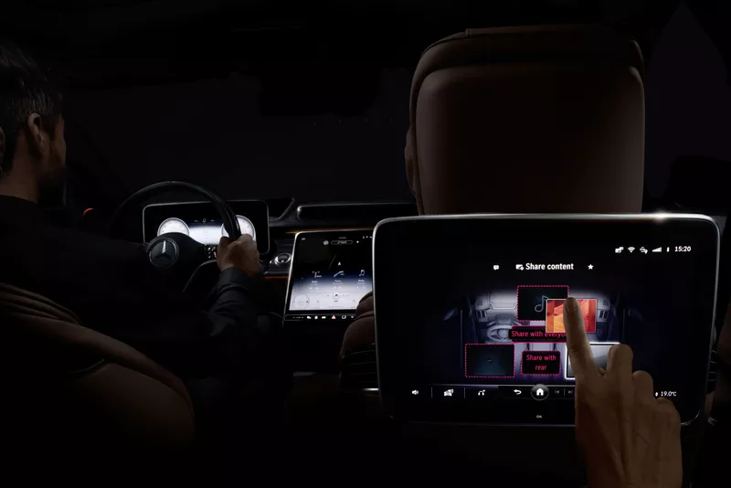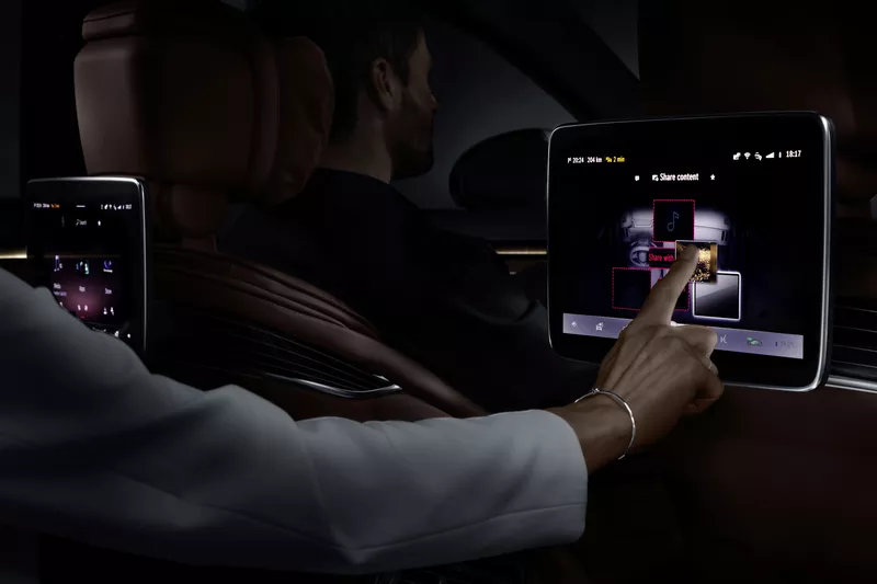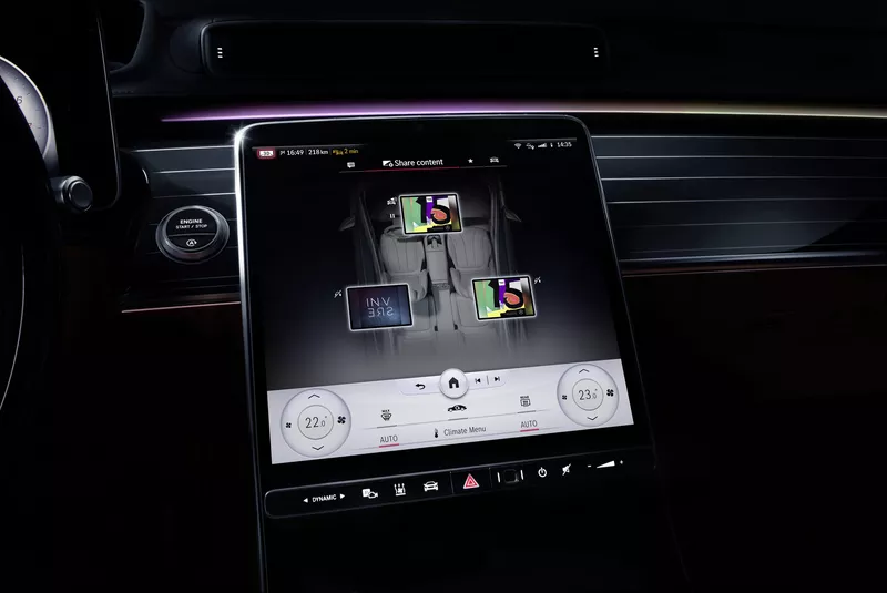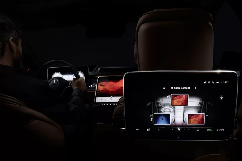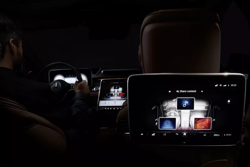 此外,全新S级车内最多配备有5个液晶显示屏,除了前排搭载两个之外,后排可配备三个。同前排显示器一样,可独立控制车内相应的功能开关,并且5个显示屏能够实现联动,提升人机交互体验。