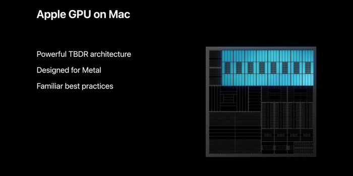 按照苹果的说法,其Apple Silicon采用了TBDR(Tile Based Deferred Rendering)图形渲染架构,也就是块状延迟渲染,这与当前N卡、A卡的实时渲染(IMR)截然不同。
