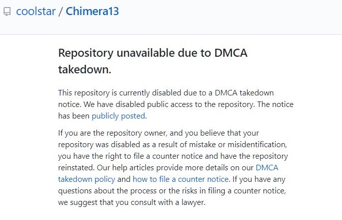 最终 GitHub 在接到 Unc0ver 的 DMCA 通知之后,按要求移除了 Chimera13 的存储库,以及数十个相关分支。现在访问的话,只能看到官方存储库和各个分叉都不可用的提示。