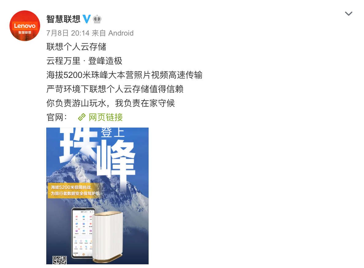 昨日,@智慧联想 官方发布微博,官宣联想个人云存储在珠峰完成了远程数据传输任务,此次在覆盖珠峰地区的5G网络的加持下,联想个人云存储顶住了珠峰大本营严苛的网络环境考验,顺利完成了远程数据传输任务并且全程保持高速稳定,可以看出产品实力值得肯定。