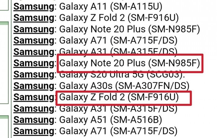 根据 IEMI 数据库中提供的信息,Galaxy Z Fold 2 的设备型号为“SM-F916U”。而即将到来的 Galaxy Note 20 Plus 设备型号为 “SM-N985F”。