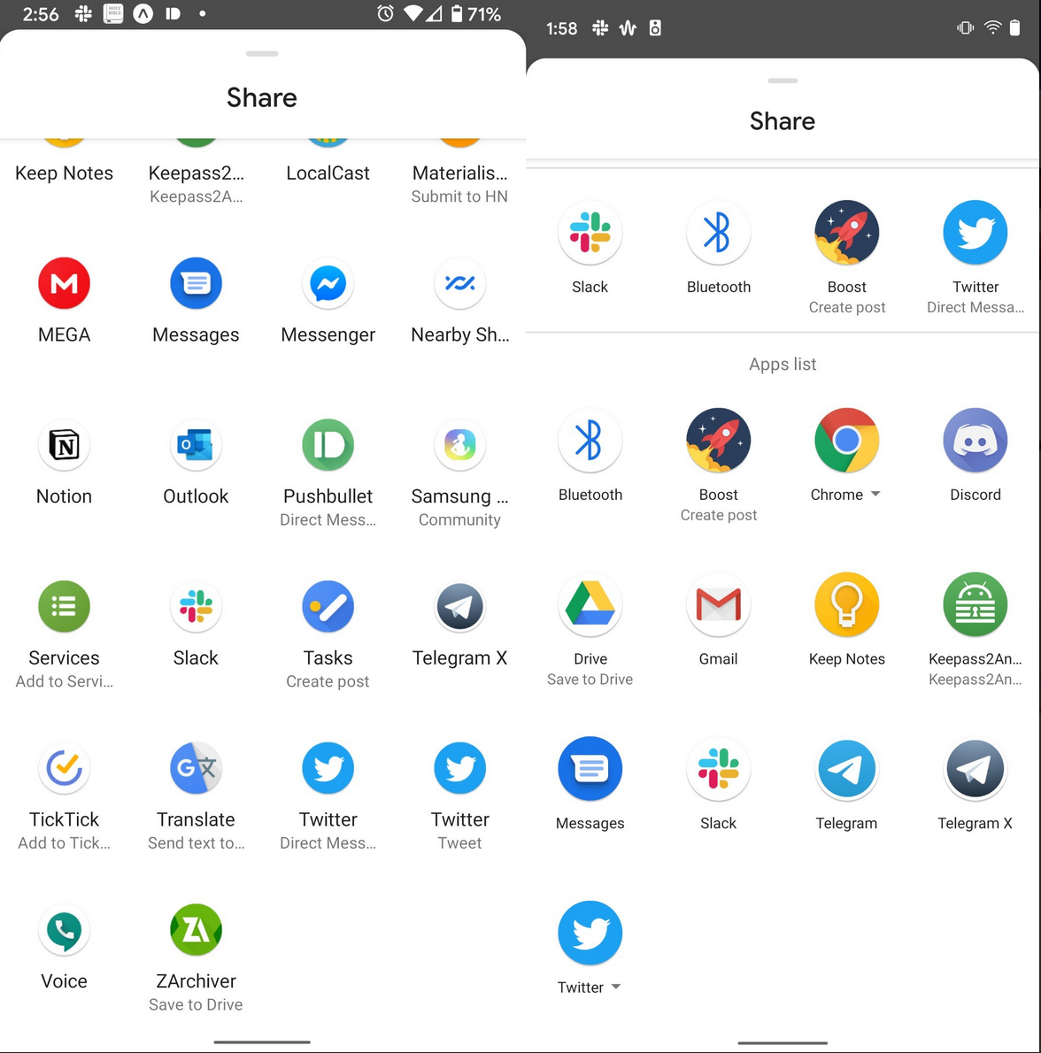 Android 10(左)和Android 11(右)分享菜单对比