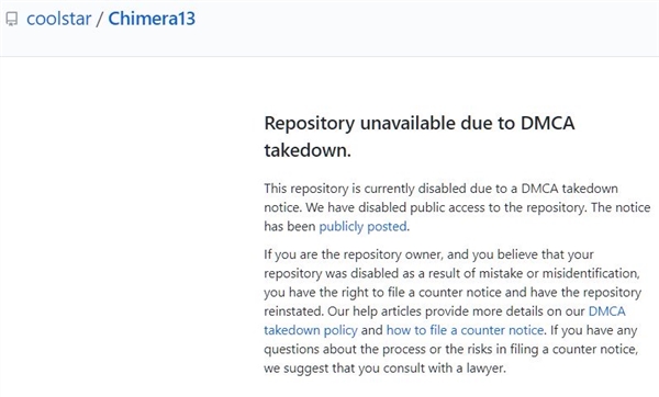 iOS越狱本身的热度就在降低,万万没想到的是,越狱圈子内部也互相干起仗来。本周,出于保护目的,GitHub基于Unc0ver的DMCA(数字千年版权法)审查要求,移除了Chimera13越狱代码存储。Chimera13是iOS 12时代主流的越狱工具,而Unc0ver则是iOS 13时代目前唯二的越狱工具之一,比较为人称道的是,其最低可以支持iOS 11。