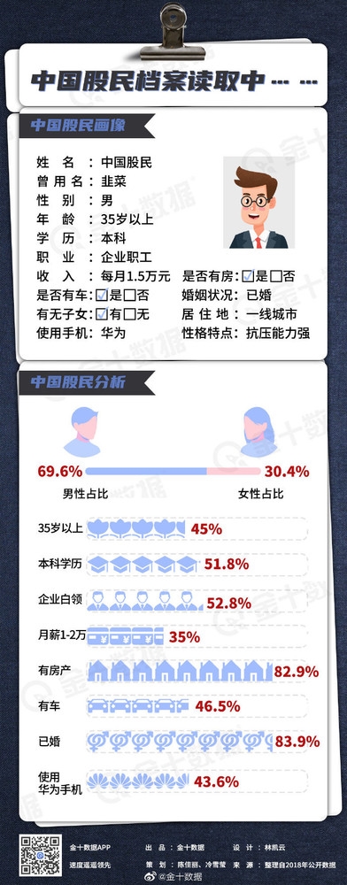 日前,一家数据公司发布了中国股民画像:35岁以上男性,本科学历,企业白领,爱用华为手机,已婚已育,有房有车,抗压能力强……据了解,这张画像是根据2018年公开数据整理而来。值得注意的是,43.6%的股民都在使用华为手机。