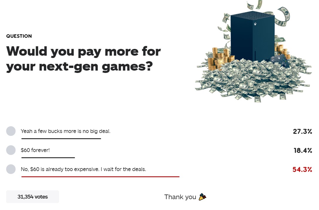 截止目前,一共有31354名玩家参与了投票,其中有27.3%(约8559人)的玩家选择了“可以,多花几美元也没什么大不了的”;18.4%(约5769人)的玩家希望保持60美元的价格;而54.3%(约17025人)的玩家表示“不能接受,60美元已经很贵了,我还是等折扣吧”。