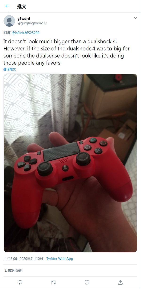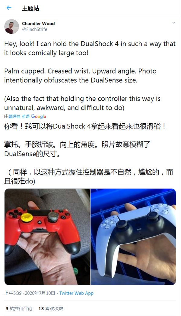 随后有网友拿 DualShock 4 手柄进行了对比,表示考虑到掌托、手腕的弯曲以及向上的角度,两者尺寸基本上相同。