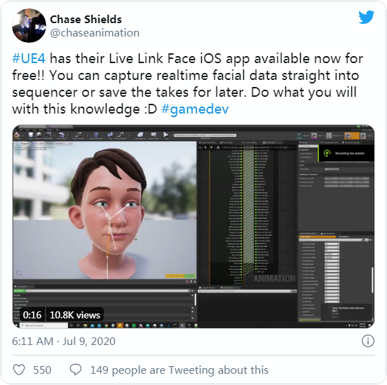 Verizon Media 动画技术总监 Addy Ghani 亦对《Live Link Face》赞赏有加,称之可借助 iPhone ARKit 实现高质量的面部动画捕捉,让手机轻松变身为一款简化的生产工具,很适合专业工作室或小作坊使用。