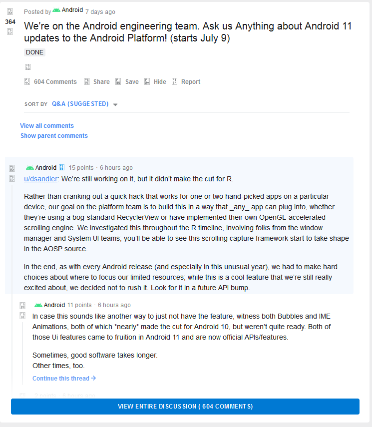 在今天的 AMA 活动中,丹·桑德勒(Dan Sandler)确认 Android 11 的最终版本中将不包含滚动截屏功能。至于原因,是 Android 11 目前还没有做好充足的准备。