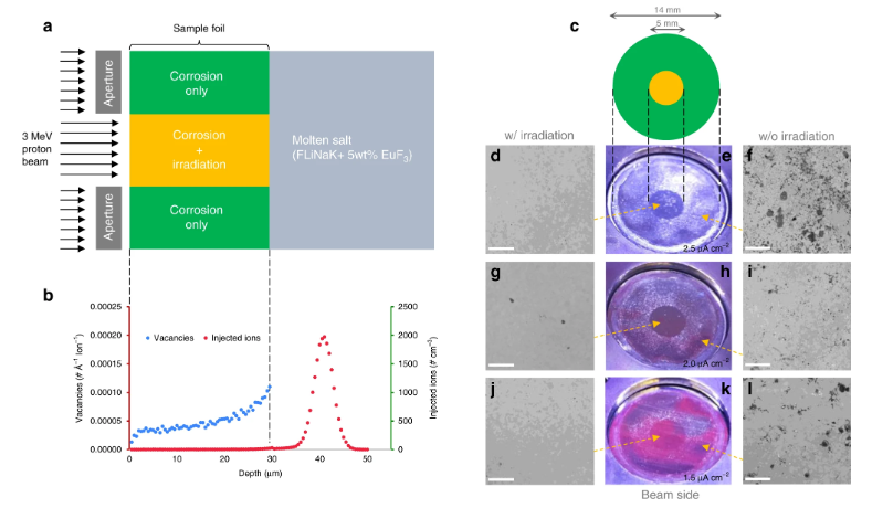 这些实验以某种核反应堆为中心,它使用钠、锂和钾的熔盐作为冷却剂。这种高温、咸味的混合物会对周围的合金造成破坏,随着时间的推移腐蚀金属。但研究小组发现,当这种合金受到质子加速器的辐射轰击时,腐蚀的发展需要两倍的时间。
