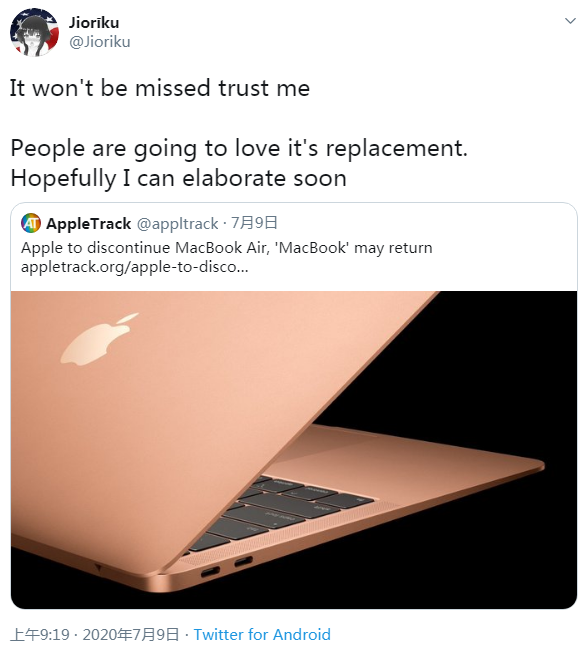 @Jioriku 在 Twitter 上转发了 @ApplTrack 报道的“苹果将停产 MacBook Air 产品线”的消息,并表示大家会很喜欢即将到来的继任者。