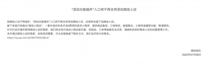 7月10日消息,微信团队发布公告,表示因微信小店不再维护,“添加功能插件”入口将不再支持添加微信小店,后续会全面下线微信小店。微信同时表示,接下来会推出“微信小商店”,这是一套升级后的免开发0费用的卖货小程序,提供商品售卖、订单物流、客服售后、小程序直播等功能,敬请期待。