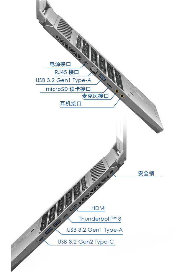 外部接口,机身左侧RJ-45、USB-A 3.0、microSD、3.5mm耳机和麦克,右侧HDMI、雷电3、两个USB-A 3.0、一个USB-C 3.0。