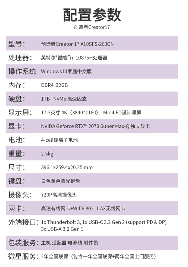 其他配置方面,微星创造者17采用Intel十代酷睿i7-10875H处理器,8核心16线程,最高频率5.1GHz,NVIDIA RTX 2070 Super Max-Q独立显卡,32GB DDR4内存,1TB NVMe固态硬盘,Wi-Fi 6无线网卡,4芯锂离子电池,白色单色背光键盘,丹拿双响单体扬声器,内部是三风扇七热管的COOLER BOOST Trinity散热系统。