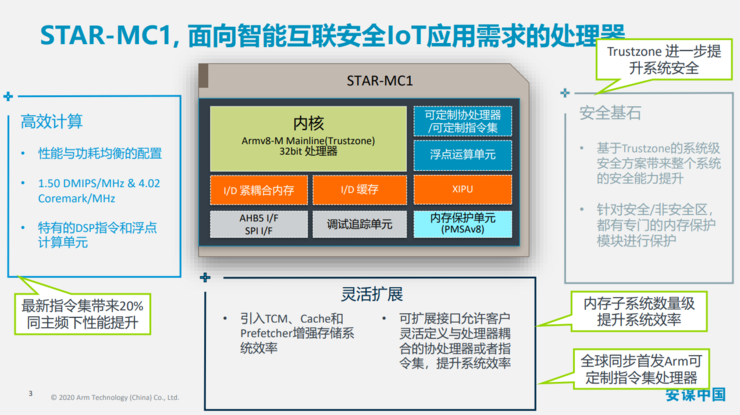 STAR-MC1作为“星辰”系列产品的第一款产品,支持现有的Armv8-M架构的所有特点以及最新的指令扩展。根据安谋中国产品研发副总裁刘澍的说法,该款处理器是一款非常紧耦合性的高效微处理器,性能达到1.5DMIPS/ MHz -4.02Coremark/MHz,同时继承Armv7和Armv8结构的DSP指令和浮点计算单元。同上一代Arm处理器相比较,在同一主频下,这些新结构体系的升级可以使STAR-MC1的性能提升20%。