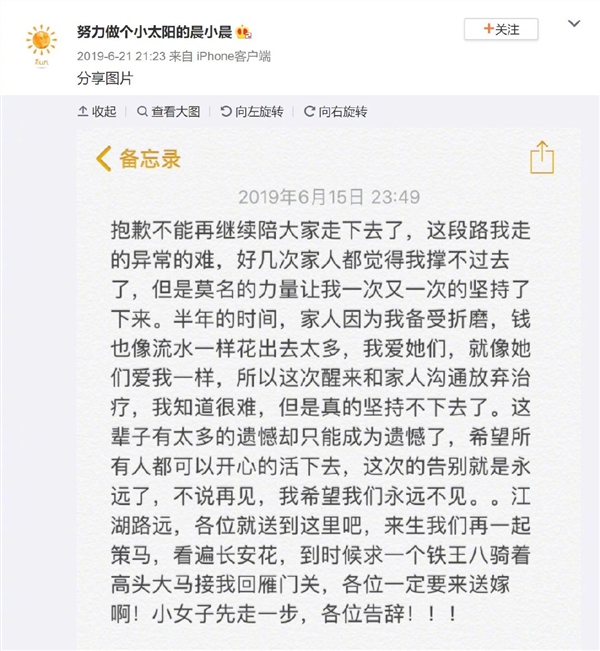 1、@努力做个小太阳的晨小晨 该账号2018年12月关注抑郁症超话并首次发博。2019年6月,在该账号唯一登录着的移动设备上发布疑似离世的帖文,此后转为只刷微博不发言,直至今年3月在相同设备上发帖声称“回来了”。账号始终未发现被盗状况。