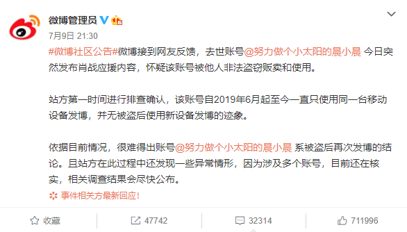 日前,微博官方公告称,接到网友反馈,去世账号@努力做个小太阳的晨小晨 突然发布明星肖战应援内容,怀疑该账号被他人非法盗窃贩卖和使用。在经过调查后,微博官方发布长文做出回应,详细解释了事情的来龙去脉。