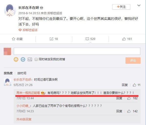 2、在排查过程中,微博注意到,该设备上还登录有两个账号:@长乐在不在呀 和 @再来一瓶我还能喝。其中,@长乐在不在呀 亦曾经活跃在抑郁症超话,2018年8月14日发布疑似离世的帖文后,也转为只看不发言。