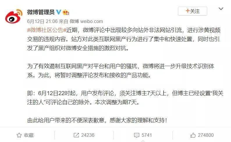 2020 年 6 月 12 日晚间,新浪官方账号 " 微博管理员 " 发布了一条公告,内容如下: