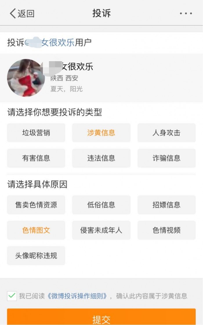 微博点击右上方,选择投诉——涉黄信息即可完成举报: