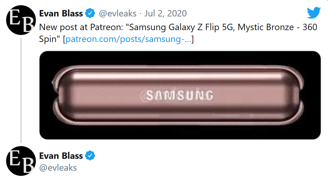 据外媒报道,三星Galaxy Z Flip 5G在配置上跟非5G没有太大区别。除了5G功能,Galaxy Z Flip 5G还将采用全新的神秘青铜色(Mystic Bronze)。来看看爆料大神evleaks带来的最新宣传视频吧。 据了解,三星Galaxy Z Flip 5G将配备两块电池--2500mAh和704mAh,另外支持最高可达15W的快速充电。