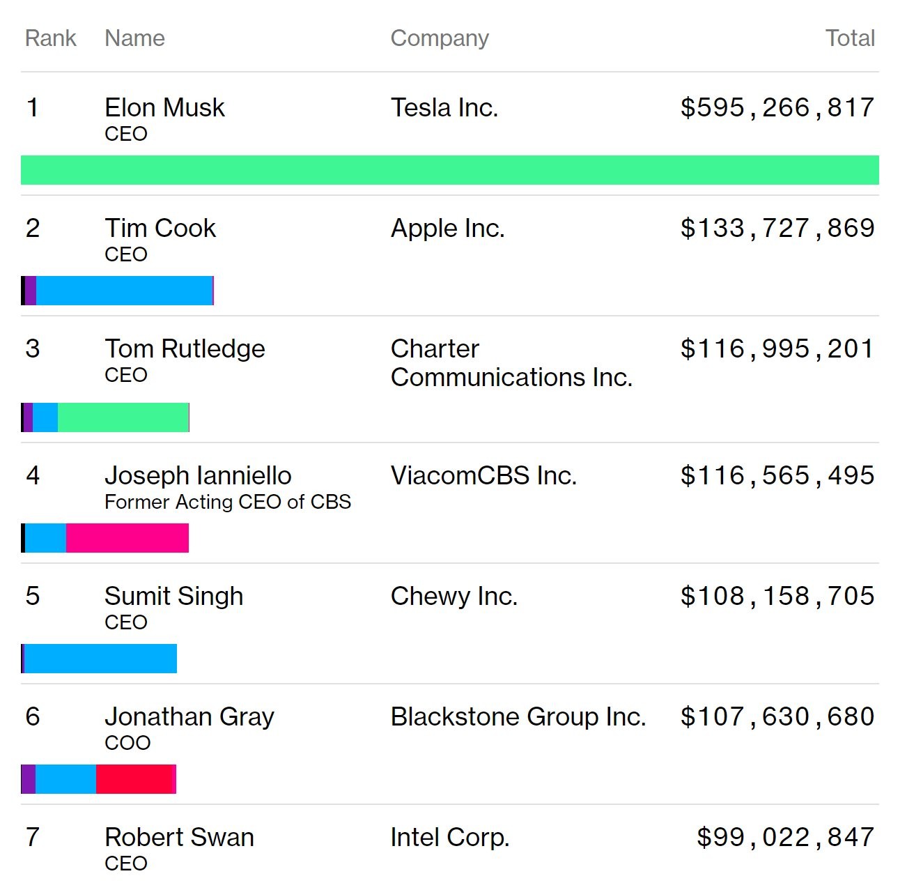 总的来说,科技行业仍然在这些排行榜上占据着主导地位。彭博社的数据显示,在前十名的CEO中,不少于4名来自这个行业。蒂姆·库克、桑达尔·皮查伊、萨提亚·纳德拉和罗伯特·斯旺的收入合计超过5亿美元,由此可见科技公司最近的表现有多好。