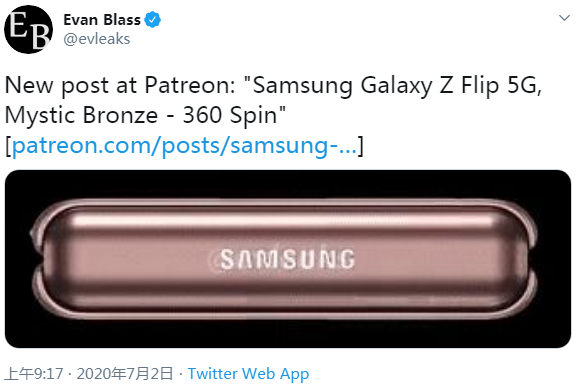 三星在本周早些时候发出了下一场线上虚拟发布会的邀请函,预计我们可在 8 月 5 号举办的 Unpacked 活动上见到多款新设备。在周五的一条推文中,知名爆料人 Evan Blass 分享了即将到来的 Galaxy Z Flip 5G 机型的宣传视频,预示这款翻盖式折叠屏新机将拥有新的青铜配色。与今年早些时候发布的原价 1380 美元的初代机型相比,两者的外形差别并不大。
