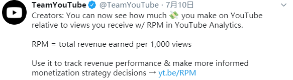 “RPM是你在YouTube上赚钱速度的快照,”谷歌支持页面上的一篇新博客写道。“无论RPM是上升还是下降,它都能很好地表明你的收入策略中哪些事情是有效的,哪些是无效的。”