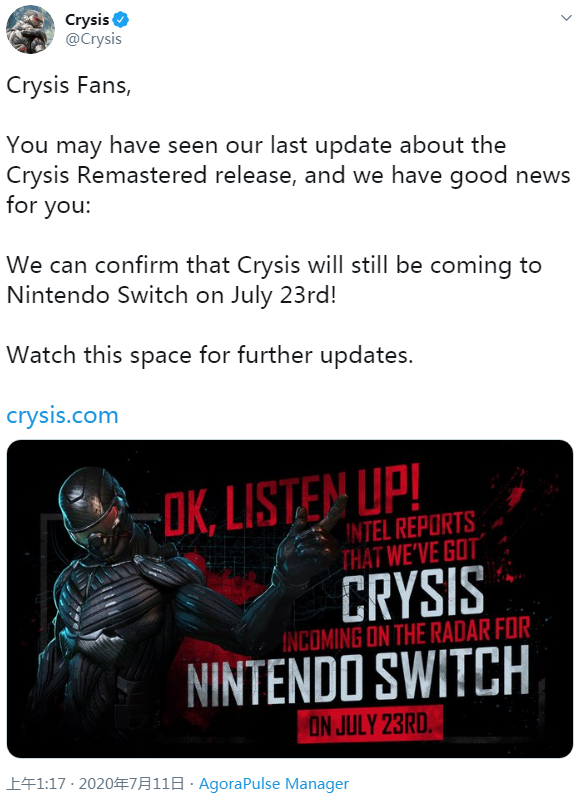 上周,或许是泄露的预告片和截图没有引发粉丝们的强烈反响,Crytek 在最后一刻推迟了《孤岛危机》重制版的发布。目前该游戏在大多数平台上都未敲定确切的发布日期,但任天堂 Switch 平台却是个例外。@Crysis 官方 Twitter 账号刚刚宣布,Switch 版本的《孤岛危机》重制版,仍将于 7 月 23 日与大家见面。