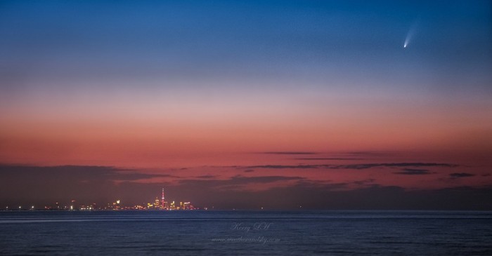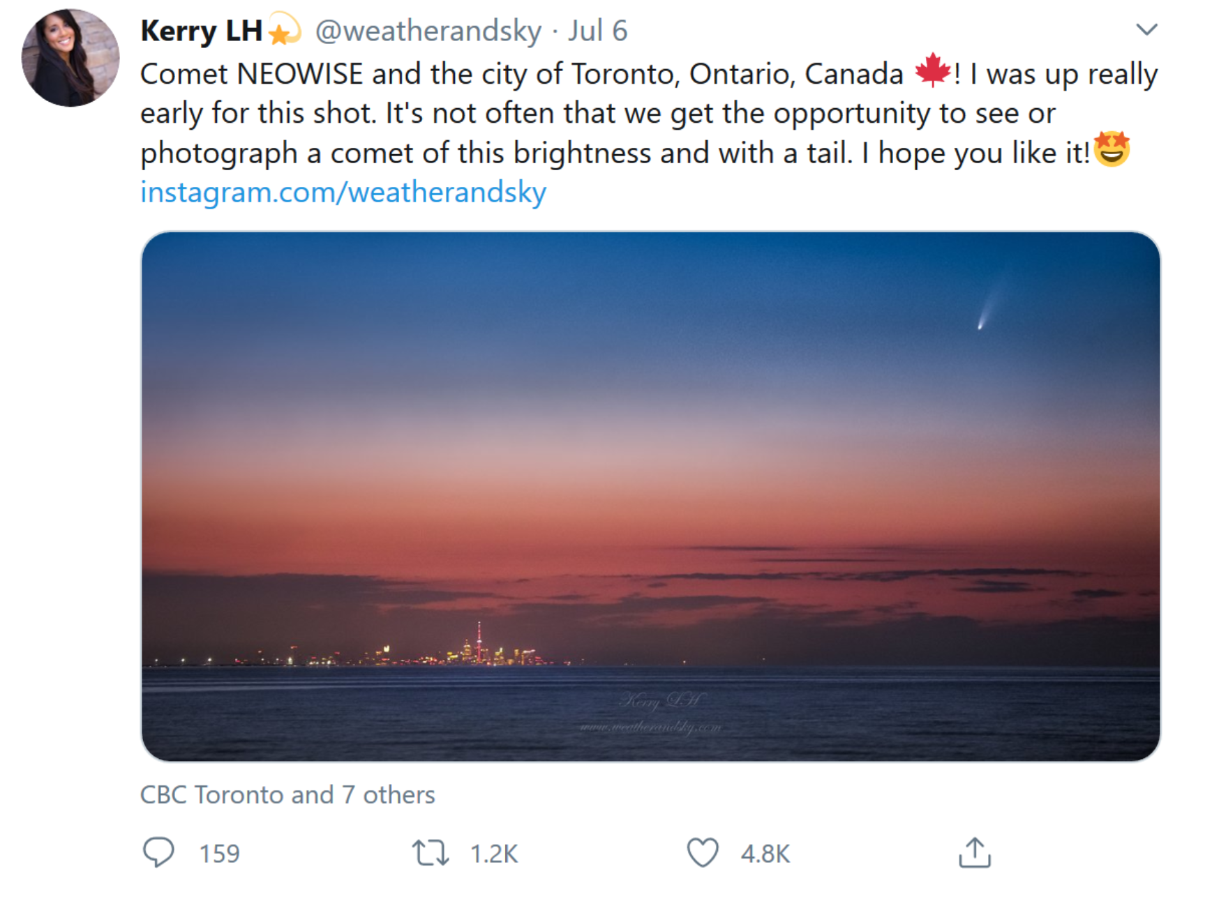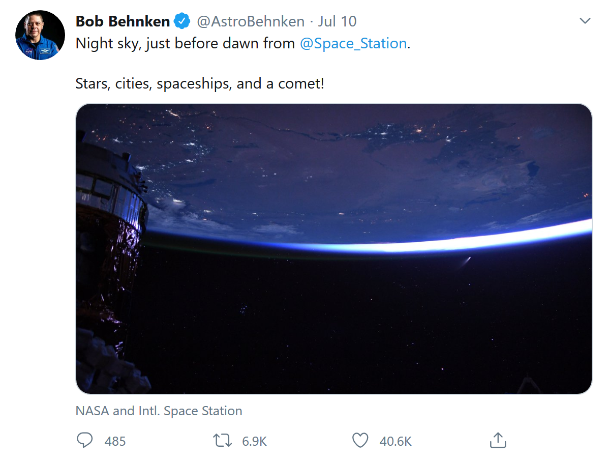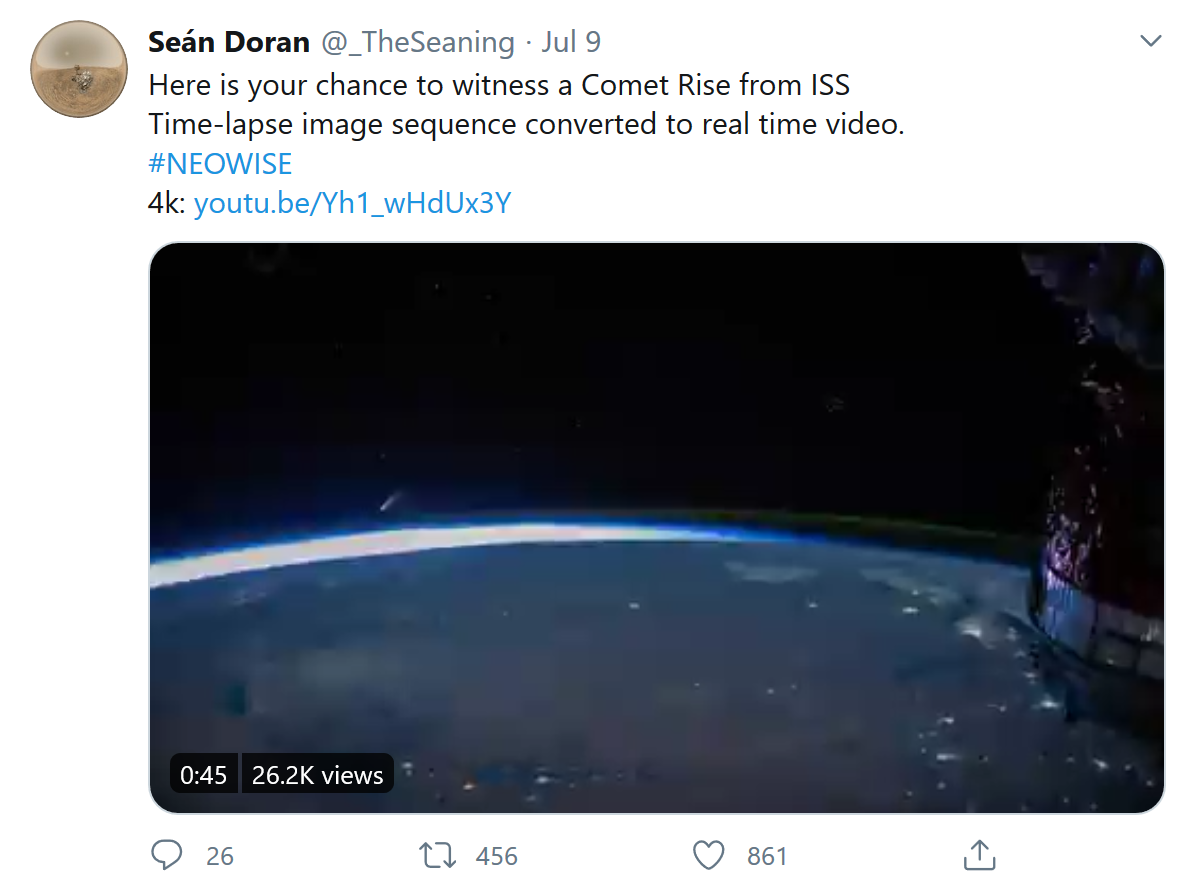 在上周的大部分时间里,NEOWISE在北半球日出前约一个小时出现在东北部的地平线上。人们能用双筒望远镜发现它,不过也有些人声称用肉眼也能看到它。许多天文摄影师在太阳出来之前抓拍到了彗星的壮观景象,这其中包括了来自国际空间站上的宇航员。