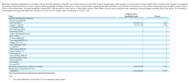 据报道,近日,阿里巴巴集团向美国证监会(SEC)提交财年报告。报告显示,截至7月2日,马云持股降至4.8%,蔡崇信持股降至1.6%,软银所持股份比例降至24.9%,仍为阿里巴巴的最大股东。去年6月,马云持股比例为6.2%,软银为25.9%。阿里巴巴合伙人达38位,天猫和淘宝总裁蒋凡进入名单。